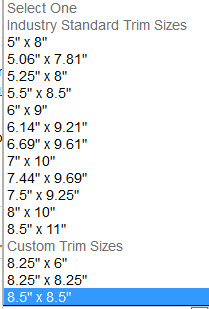 This is what KDP offers right now. Of those, I’d start with 5.25 by 8, because the 5×8 cover is too tall and narrow. (A 5 by 8 cover is exactly the “ideal proportions” Kindle wants for cover art – 1.6 – but this is a recommendations all traditional publishers ignore because it looks too tall and narrow, perfect for an iPhone 5 screen maybe but on most devices ill-fitting.)