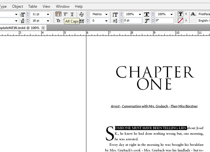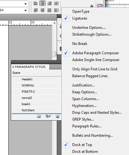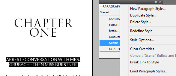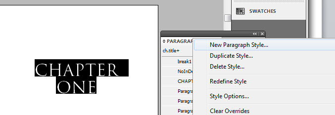 I’ll highlight the “Chapter One” text and set it to Trajan Pro, all caps to match the cover. Then I’ll highlight the text again, and hit the little panel button on the top right of the Paragraph Styles panel (right under the X to close the panel). I’m going to save this as a “new paragraph style” rename it “header1.”