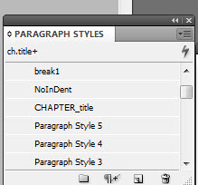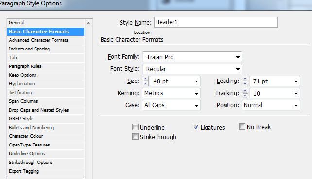 Now “Header1” shows up under my Paragraph Styles – next time I get to a chapter heading, I’ll just highlight it and hit that style. If I want to edit the style for all chapter headings, I’ll click on the style in the Paragraph Styles panel and adjust things (for example, I’ll probably want the letters to be spaced out a bit, so I can go to “basic character formats” and increase the “tracking.”)