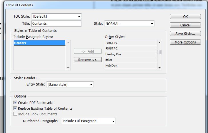 I used “Header1” for the chapter titles, so I need to add that style to the TOC instead of the default ones.