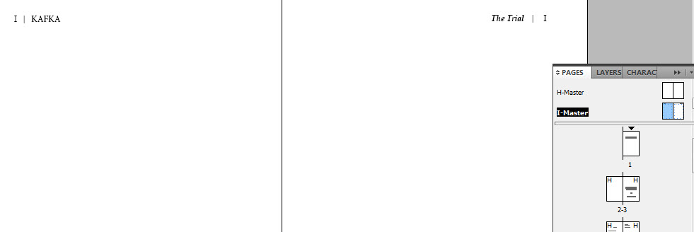 I don’t want to do anything with the page numbers, which display here as only the symbol “I” (if this is confusing, my master pages could have been named “A” or “B” or something else. It’s just in this template I started with, they are called “H” and “I”.)
