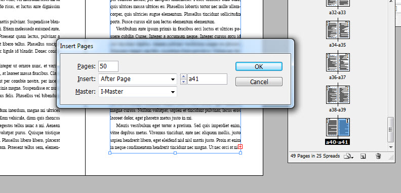 First, I’m going to insert some more pages. I right click on that last page (in the Pages Panel) and choose “insert pages.” I’m going to add 50 for now.
