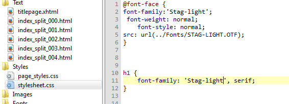 Let’s change the font of the chapter headings. First, we need to import the font. Hit the “+” button on the top left, navigate to your fonts folder, and select a font (you could also copy and paste your font into the same folder your ebook files are in).