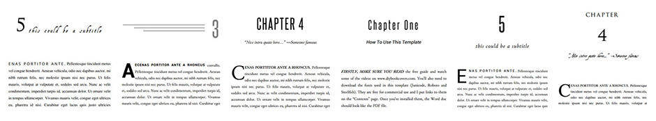 This free package includes 5 minimal templates, with about 5 chapters preformatted for you. Each one has several potential design choices and fonts: pick the one you want and remove the rest. I encourage you to match the fonts to your book cover design or genre, without going crazy. In general, the younger the audience (children's/young adult) the "bigger" or more flashy the design will be. For most adult books, a clean, understated design is best.