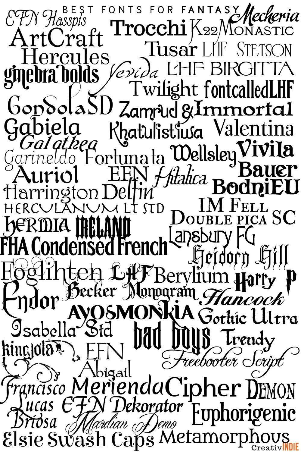 The above lists are a little old, here’s a newer version of some fancy, beautiful fonts for fantasy book covers. Sorry this image isn’t high quality, not sure what happened to it. Keep in mind, this is kind of too much. Most fantasy and urban fantasy covers use the same *best* fonts which are….